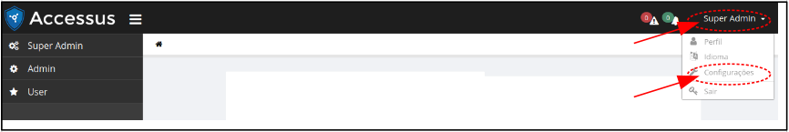 No canto superior direito do Painel, clique no menu suspenso em "SuperAdmin" e depois em "Configurações":