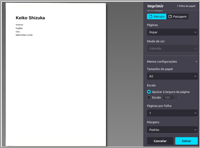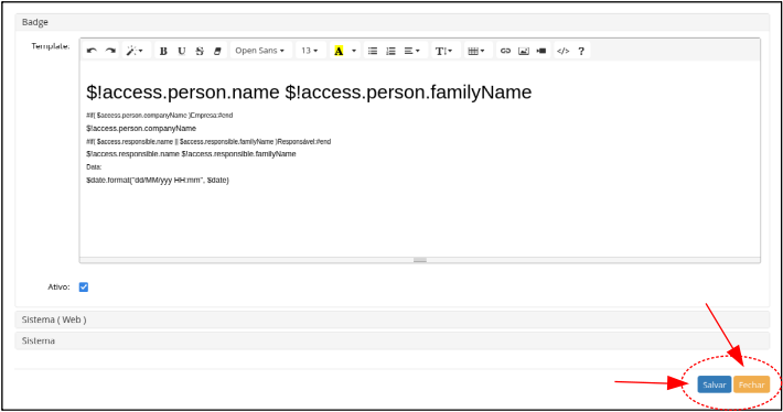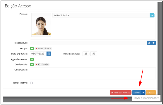 Em "Salvar", clique no menu suspenso do botão e a opção imprimir badge estará disponível. Ao clicar na opção, será redirecionado automaticamente para a página de impressão.