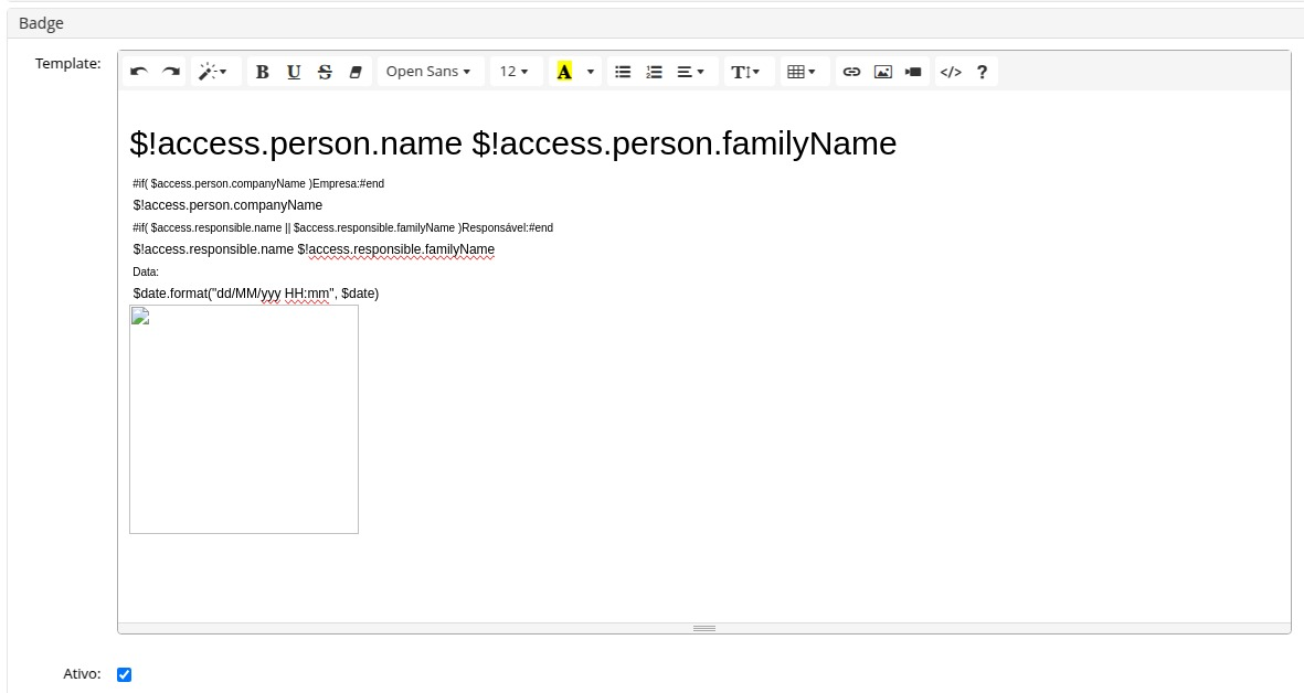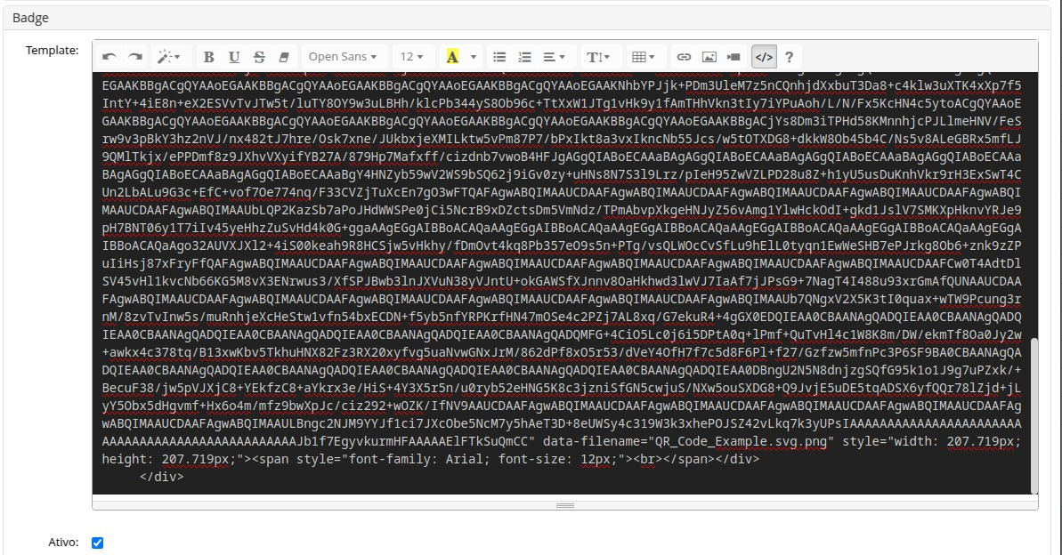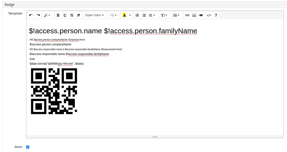É possível incluir um QR Code dinâmico no template do Badge. O QR Code será gerado automaticamente com base na credencial cadastrada.