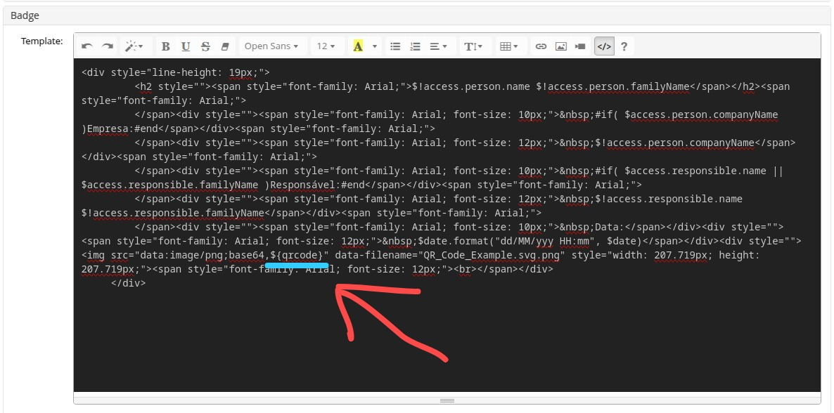 No código fonte, localize a tag <img> da imagem inserida. O atributo src conterá um código Base64 extenso. Remova apenas o conteúdo Base64 e substitua por ${qrcode}:
