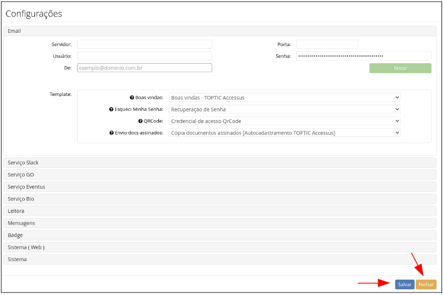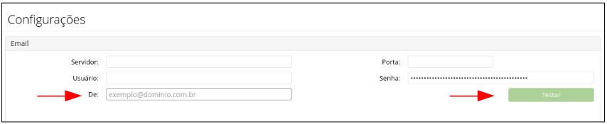 Inserir um e-mail válido que será usado para o envio das mensagens. Depois clique em "Testar" para verificar o status de funcionamento: