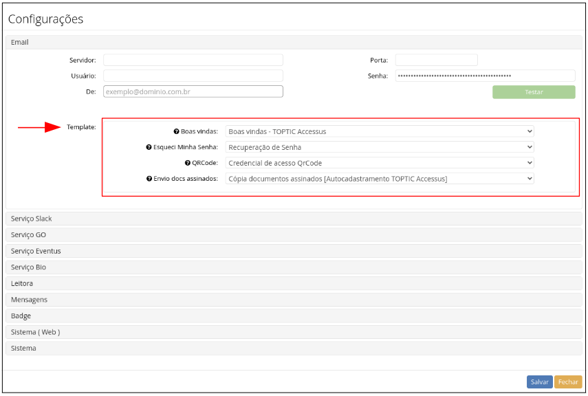 Nas configurações de e-mail são encontrados "Templates" de e-mail pré-configurados com determinadas opções de envio de mensagens: