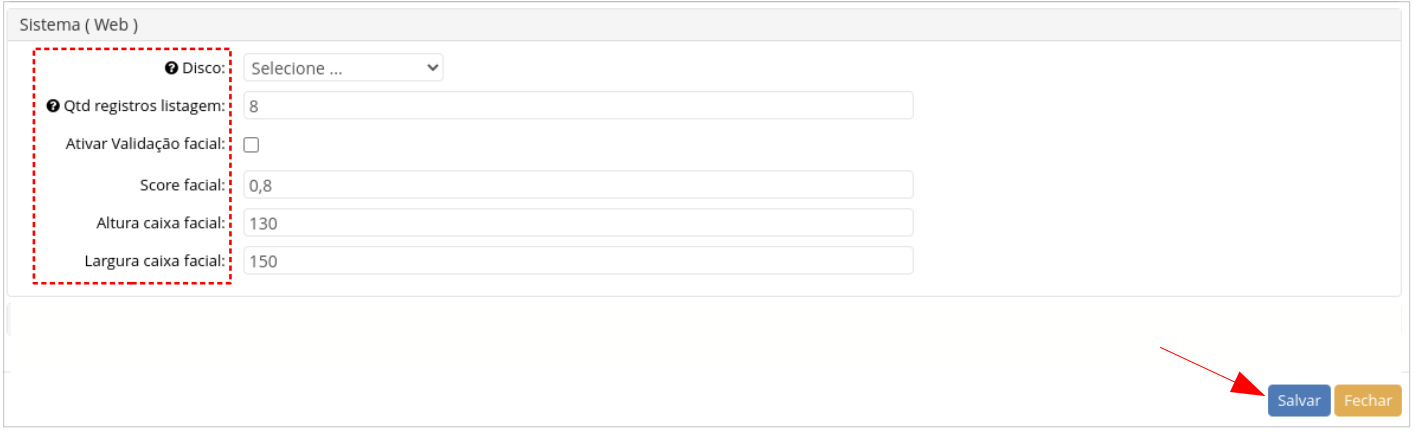 No Sistema Web, é possível modificar a quantidade de listagem dos registros, bem como realizar a validação facial. Após realizar a configuração, clique em "Salvar".