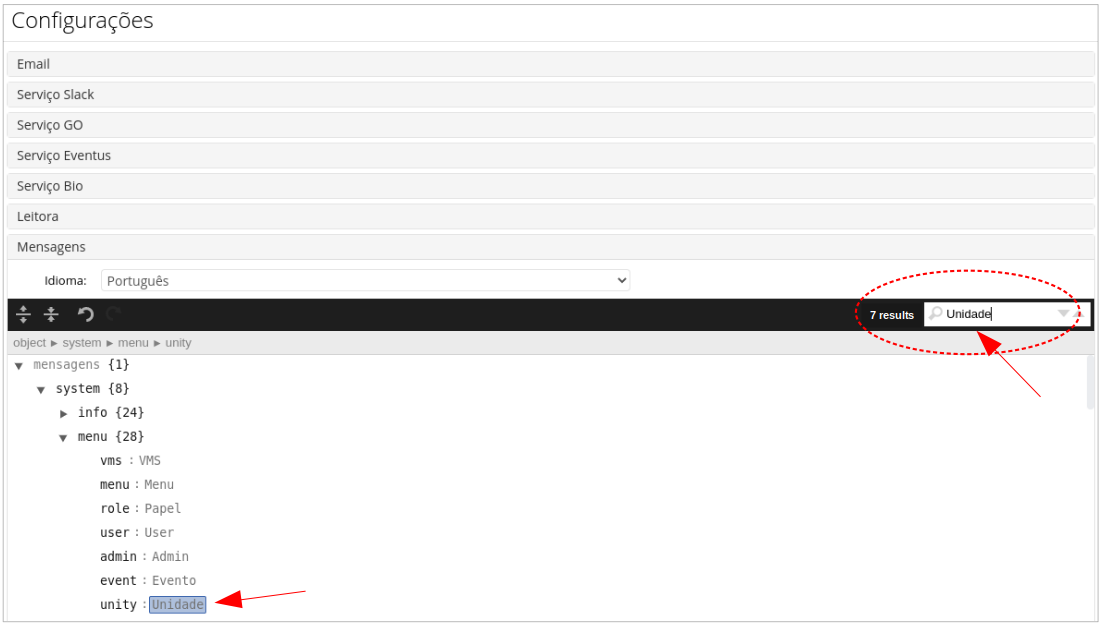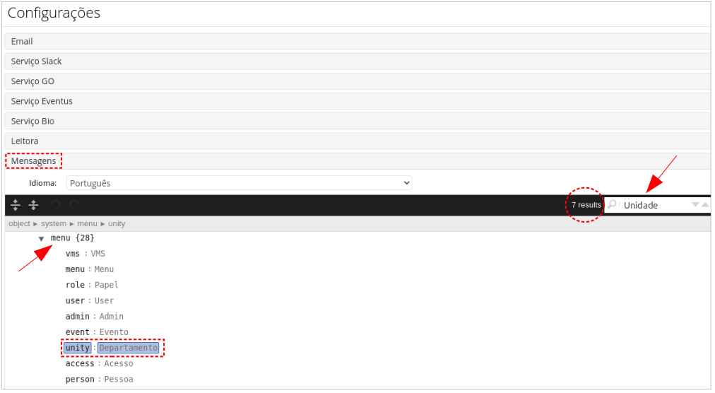 No exemplo abaixo, alterou-se o campo "Unidade" para "Departamento". Observe que a pesquisa pelo campo "Unidade" retornou 7 resultados. Assim, todos os locais que contenham o campo "Unidade" deverão ser alterados para "Departamento".