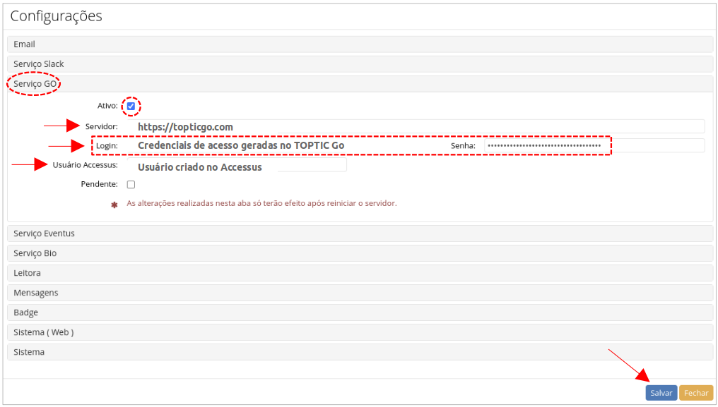 - Login e senha: credenciais geradas no TOPTIC Go.