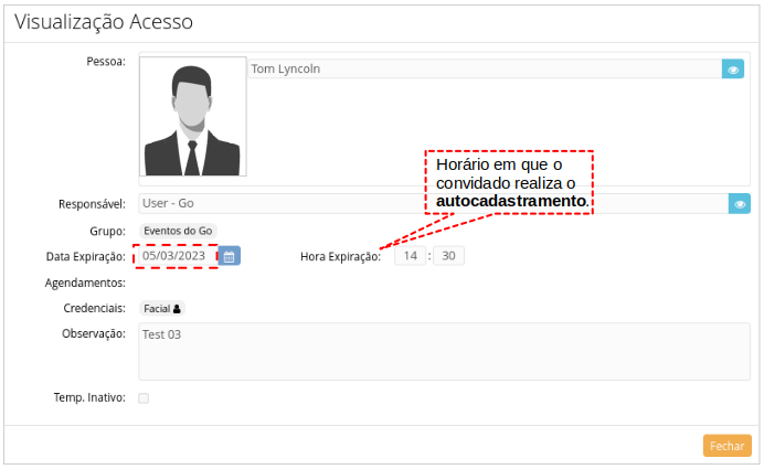 Neste outro exemplo, os Dias de validade do acesso escolhido foi menor que o Número de dias do convite. O convidado realizou o autocadastramento no dia 02/03/2023 - 13:40, logo, a permissão de acesso mais restritiva será a Data final do convite (06/03/2023) e o Horário do autocadastramento convidado (13:40).